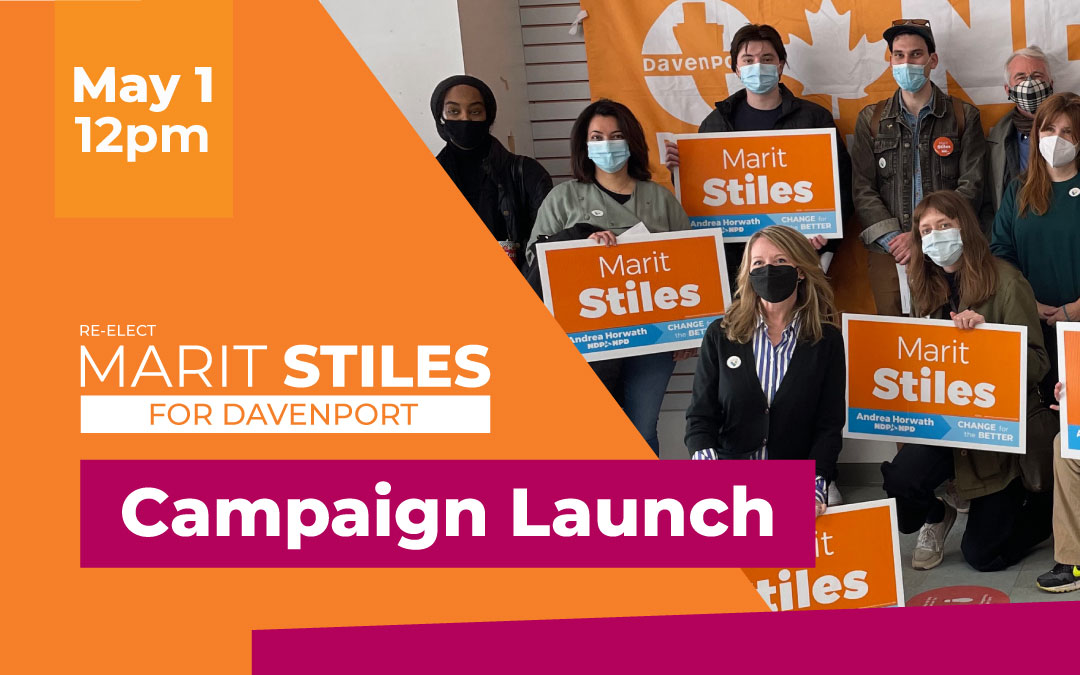 The provincial election is right around the corner and we're gearing up to re-elect Marit Stiles, our amazing MPP here in Davenport. Join us at our new campaign office on May 1st for a campaign kick-off with friends and neighbours who are ready to re-elect Marit and say goodbye to Doug Ford's Conservatives.